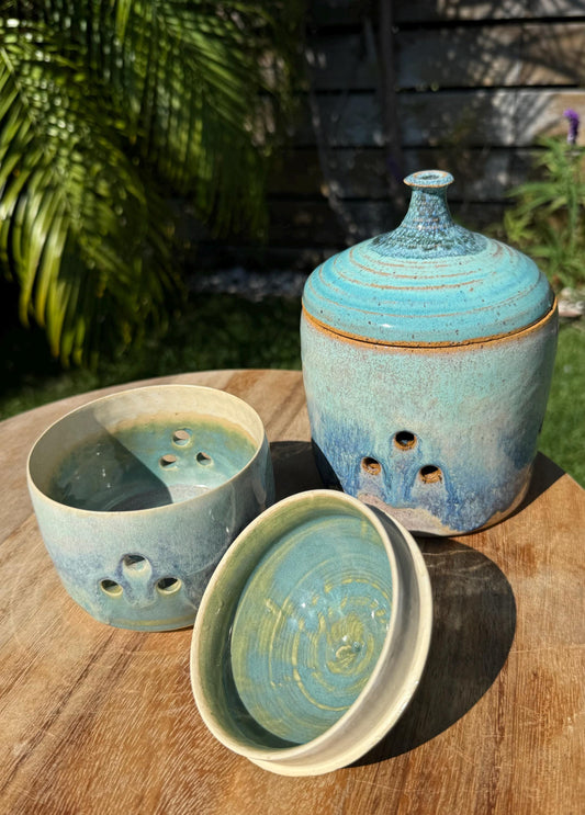Berry Bowl Colanders with wash & store built-in saucers, Ceramic Juicers perfect for mimosas, Garlic Grater plates for making fresh garlic dipping oil & marinades, Salt Cellars and Oil & Vinegar Pouring Bottles to elevate your countertop…. Need we say more?
