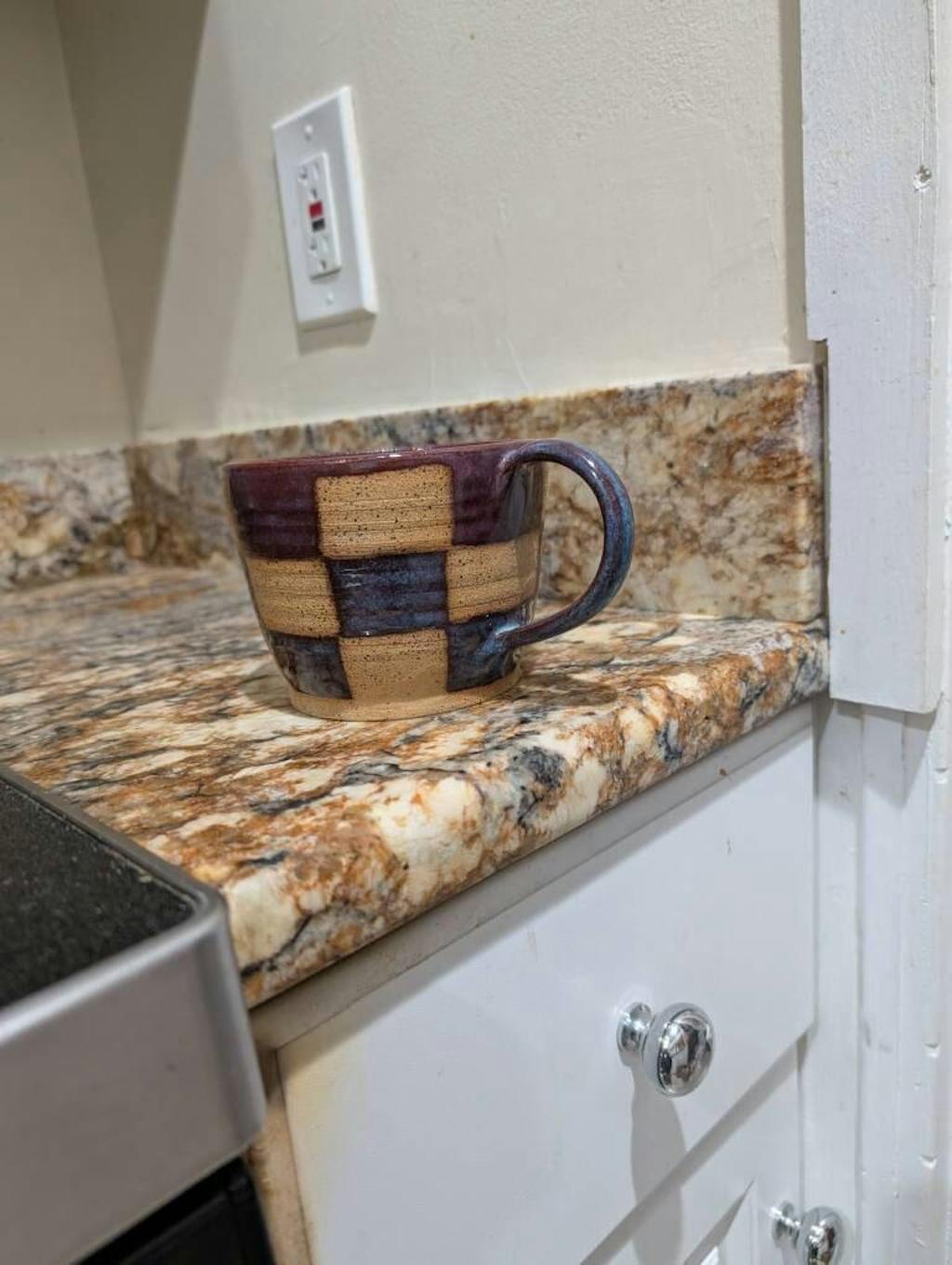 An excellent hand crafted coffee mug. I like the checkered design a lot. I especially like the inner glaze of this mug. I'd buy another one from this artisan for sure!