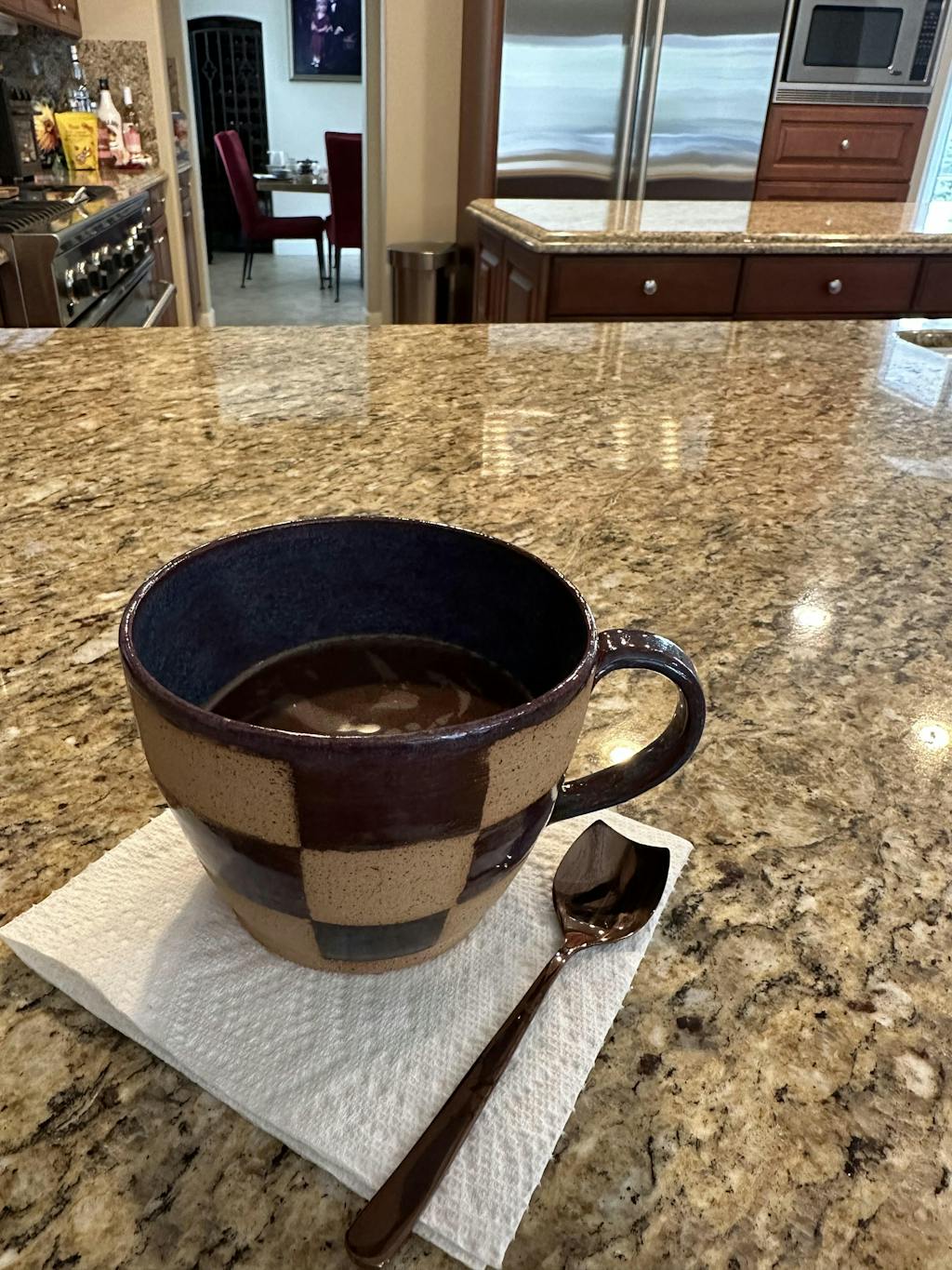 I love my new mug! It’s remarkably light weight for its size. The color is perfect. The handle is comfortable and the glaze spots line up perfectly with where’d I’d sip from, right or left handed! Thank you Courtney!!!