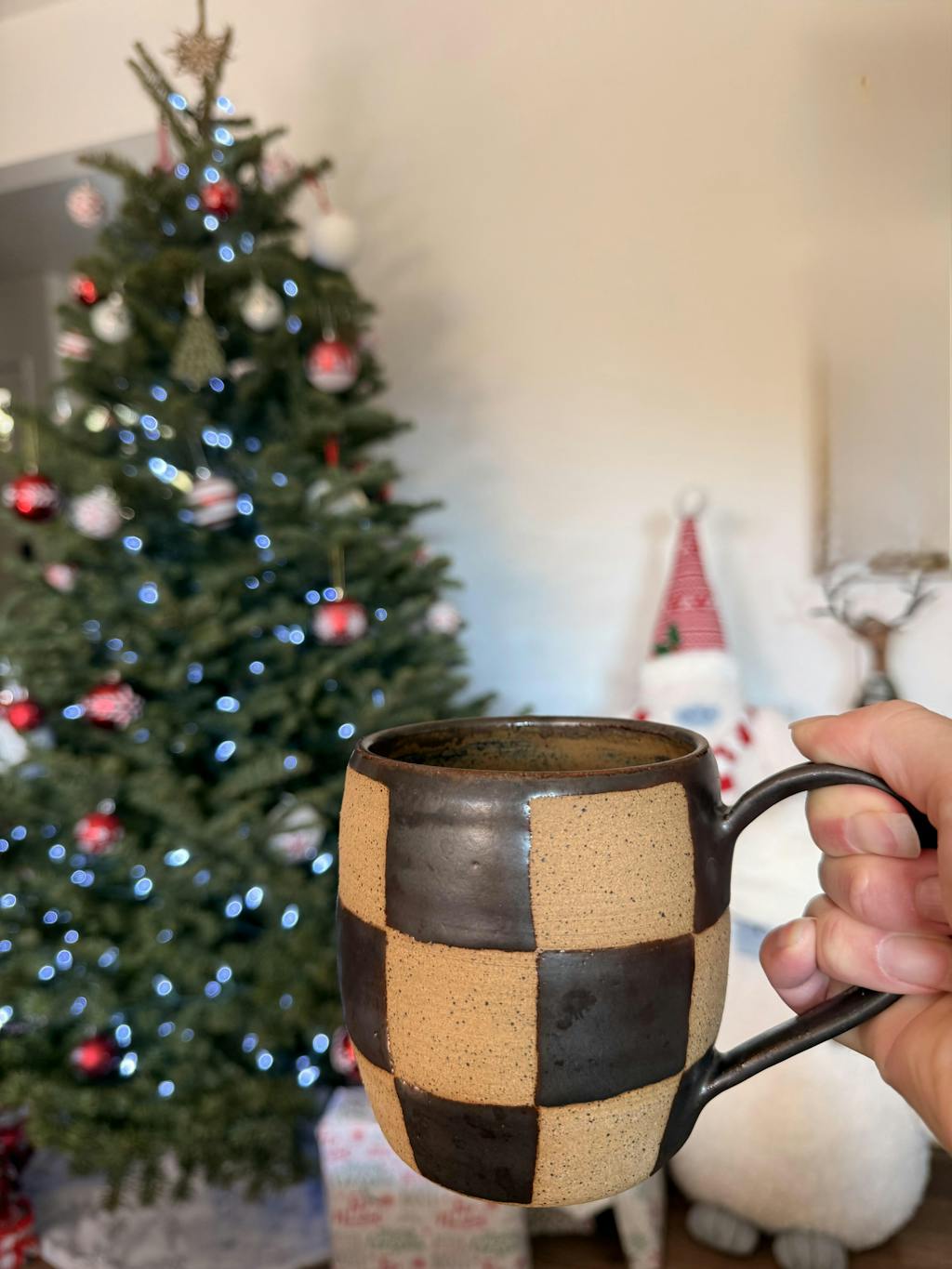 Handmade stoneware checkered ceramic mugs in a generous size of 16-20 oz. capacity with large comfortable hand-pulled handles. This classicly shaped mug is dishwasher safe and perfect for the everyday warm beverage! I throw these individually on the pottery wheel, finish, and fire them in my home studio in Costa Mesa, CA. Please always use caution with hot liquids.